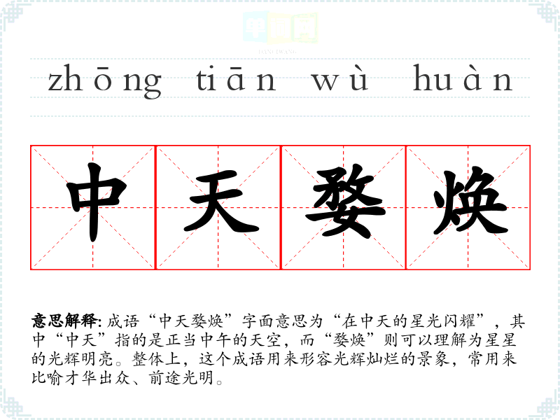 成语“中天婺焕”字面意思为“在中天的星光闪耀”,其中“中天”指的是正当中午的天空,而“婺焕”则可以理解为星星的光辉明亮。整体上,这个成语用来形容光辉灿烂的景象,常用来比喻才华出众、前途光明。