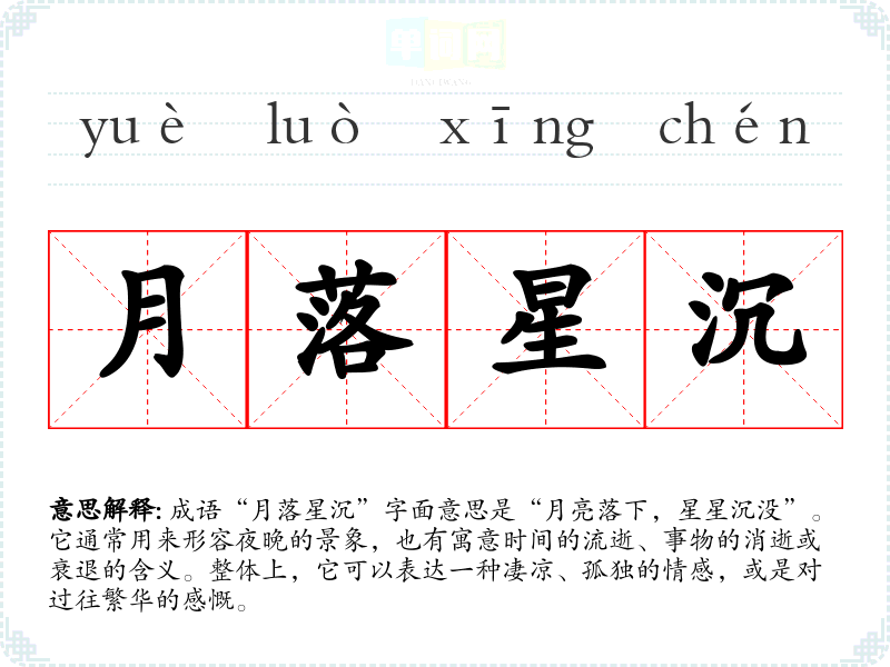 成语“月落星沉”字面意思是“月亮落下,星星沉没”。它通常用来形容夜晚的景象,也有寓意时间的流逝、事物的消逝或衰退的含义。整体上,它可以表达一种凄凉、孤独的情感,或是对过往繁华的感慨。