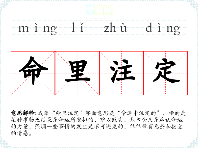- “命中注定”:与“命里注定”意义相近,强调命运的安排。