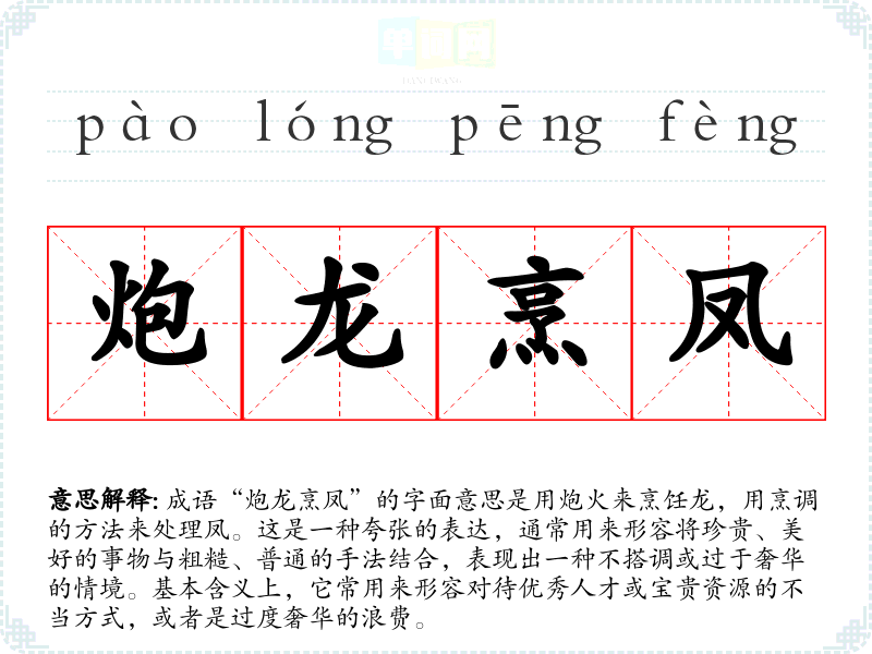 “炮龙烹凤”这一成语的具体历史背景并不明确,但可以推测它源自古代对龙和凤的文化象征。龙和凤在**文化中分别象征着权力和美德,是至高无上的象征。而炮和烹凤的结合则可能反映了一种对待这些珍贵事物的不当态度,强调了在处理珍贵资源时的粗暴和不合适。