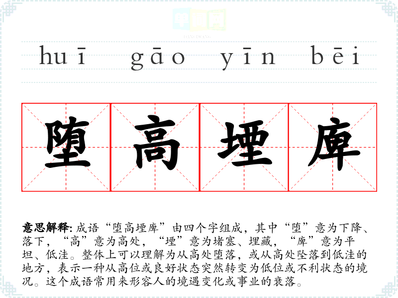 成语“堕高堙庳”由四个字组成,其中“堕”意为下降、落下,“高”意为高处,“堙”意为堵塞、埋藏,“庳”意为平坦、低洼。整体上可以理解为从高处堕落,或从高处坠落到低洼的地方,表示一种从高位或良好状态突然转变为低位或不利状态的境况。这个成语常用来形容人的境遇变化或事业的衰落。