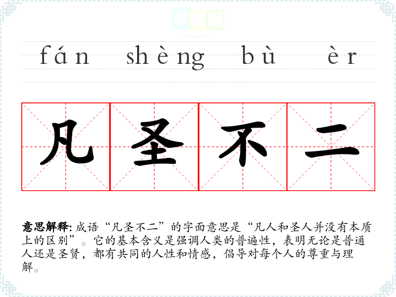 成语“凡圣不二”的字面意思是“凡人和圣人并没有本质上的区别”。它的基本含义是强调人类的普遍性,表明无论是普通人还是圣贤,都有共同的人性和情感,倡导对每个人的尊重与理解。
