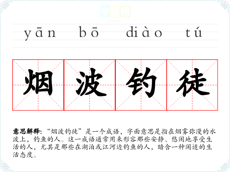 “烟波钓徒”是一个成语,字面意思是指在烟雾弥漫的水波上,钓鱼的人。这一成语通常用来形容那些安静、悠闲地享受生活的人,尤其是那些在湖泊或江河边钓鱼的人,暗含一种闲适的生活态度。