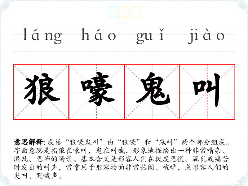 成语“狼嚎鬼叫”由“狼嚎”和“鬼叫”两个部分组成。字面意思是指狼在嚎叫,鬼在叫喊,形象地描绘出一种非常嘈杂、混乱、恐怖的场景。基本含义是形容人们在极度恐慌、混乱或痛苦时发出的叫声,常常用于形容场面非常热闹、喧哗,或形容人们的尖叫、哭喊声。