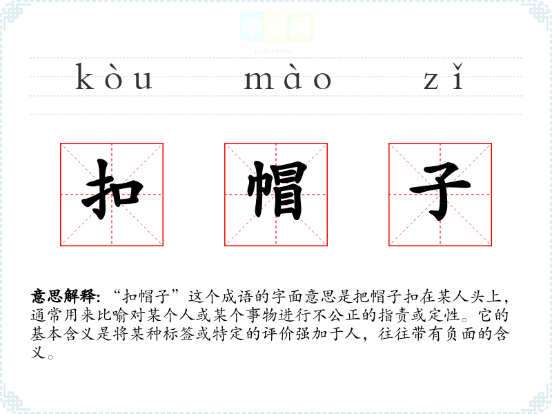“扣帽子”这个成语的字面意思是把帽子扣在某人头上,通常用来比喻对某个人或某个事物进行不公正的指责或定性。它的基本含义是将某种标签或特定的评价强加于人,往往带有负面的含义。