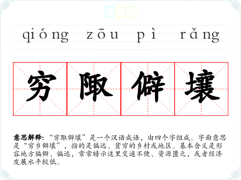 “穷陬僻壤”出自《左传》,其中有云:“穷则变,变则通,通则久。”这句话强调在困境中应当寻求变化,而“陬”和“壤”分别指狭小的地方和土地,因此整个成语强调偏远地区的处境及其可能引发的变化。