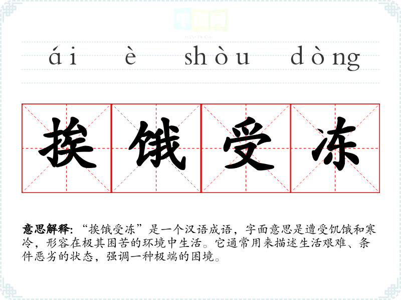 | 挨冻受饥 | 挨:遭受。指缺衣少食的穷困状况 |