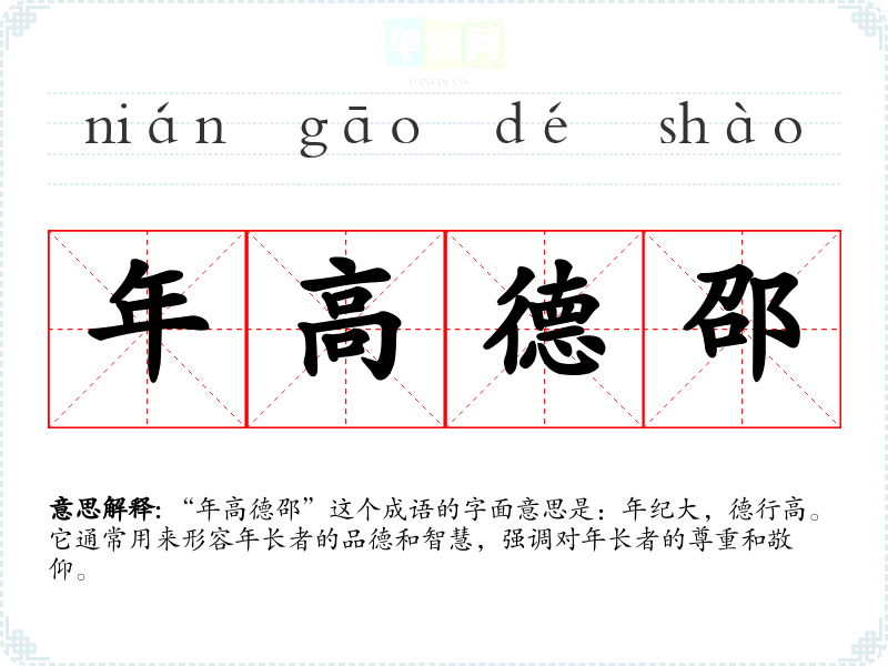 | 年高德邵 | 邵:美好。年纪大,品德好。 |