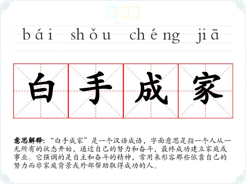 “白手成家”是一个汉语成语,字面意思是指一个人从一无所有的状态开始,通过自己的努力和奋斗,最终成功建立家庭或事业。它强调的是自主和奋斗的精神,常用来形容那些依靠自己的努力而非家庭背景或外部帮助取得成功的人。