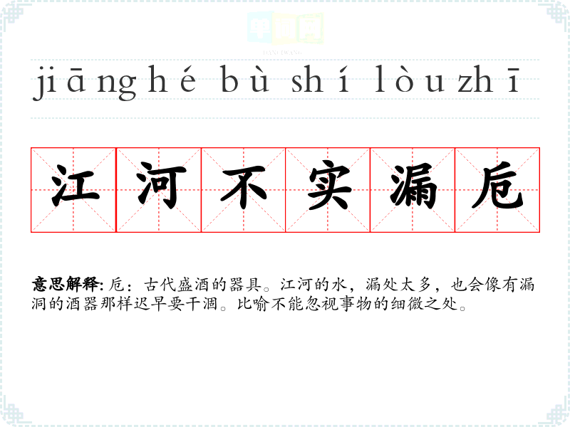 | 江河不实漏卮 | 卮:古代盛酒的器具。江河的水,漏处太多,也会像有漏洞的酒器那样迟早要干涸。比喻不能忽视事物的细微之处。 |