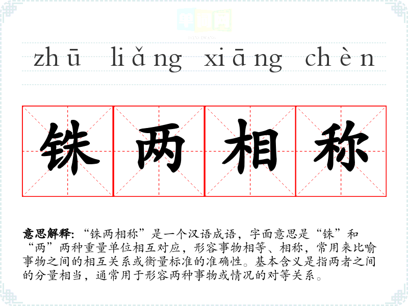 “铢两相称”是一个汉语成语,字面意思是“铢”和“两”两种重量单位相互对应,形容事物相等、相称,常用来比喻事物之间的相互关系或衡量标准的准确性。基本含义是指两者之间的分量相当,通常用于形容两种事物或情况的对等关系。