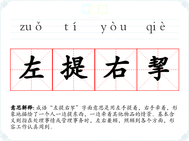 成语“左提右挈”字面意思是用左手提着,右手牵着,形象地描绘了一个人一边提东西,一边牵着其他物品的情景。基本含义则指在处理事情或管理事务时,左右兼顾,照顾到各个方面,形容工作认真周到。