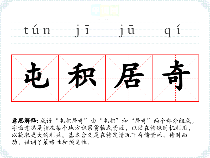 成语“屯积居奇”由“屯积”和“居奇”两个部分组成。字面意思是指在某个地方积累货物或资源,以便在特殊时机利用,以获取更大的利益。基本含义是在特定情况下存储资源,待时而动,强调了策略性和预见性。