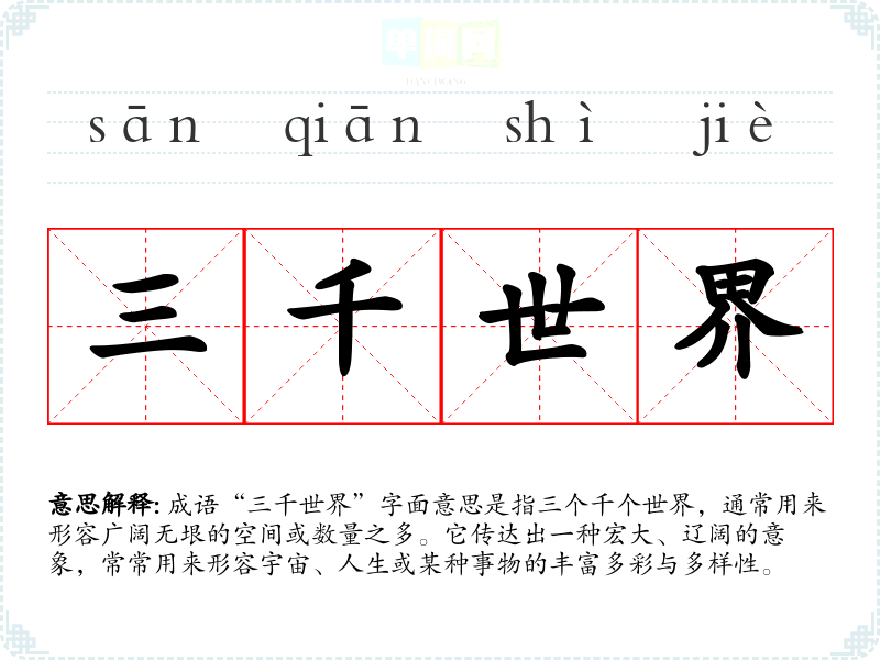 成语“三千世界”字面意思是指三个千个世界,通常用来形容广阔无垠的空间或数量之多。它传达出一种宏大、辽阔的意象,常常用来形容宇宙、人生或某种事物的丰富多彩与多样性。
