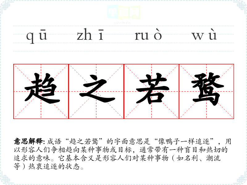 成语“趋之若鹜”的字面意思是“像鸭子一样追逐”,用以形容人们争相趋向某种事物或目标,通常带有一种盲目和热切的追求的意味。它基本含义是形容人们对某种事物(如名利、潮流等)热衷追逐的状态。