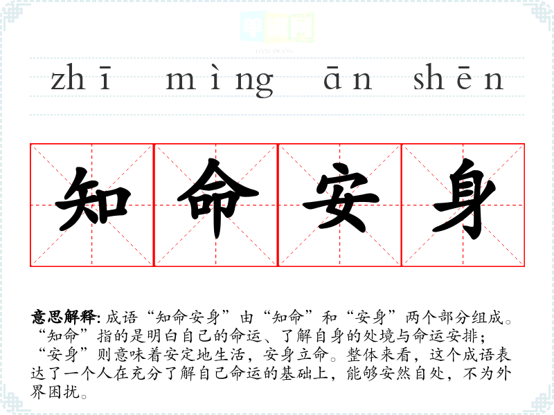 成语“知命安身”由“知命”和“安身”两个部分组成。“知命”指的是明白自己的命运、了解自身的处境与命运安排;“安身”则意味着安定地生活,安身立命。整体来看,这个成语表达了一个人在充分了解自己命运的基础上,能够安然自处,不为外界困扰。