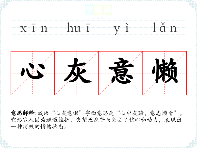 成语“心灰意懒”字面意思是“心中灰暗,意志懒惰”。它形容人因为遭遇挫折、失望或痛苦而失去了信心和动力,表现出一种消极的情绪状态。