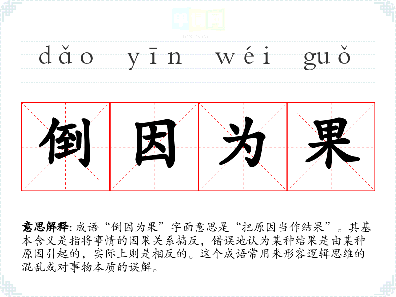 | 倒果为因 | 果:结果;因:原因。把结果当成原因,颠倒了因果关系。 |