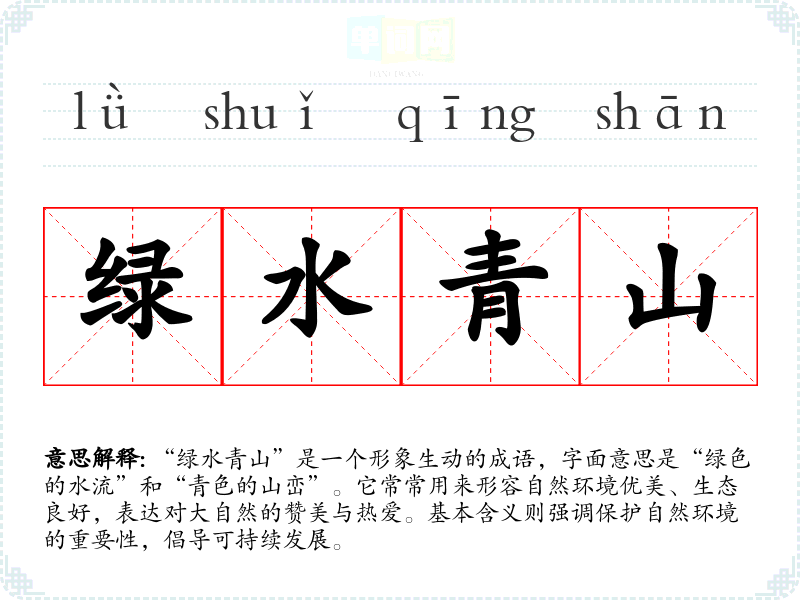 “绿水青山”是一个形象生动的成语,字面意思是“绿色的水流”和“青色的山峦”。它常常用来形容自然环境优美、生态良好,表达对大自然的赞美与热爱。基本含义则强调保护自然环境的重要性,倡导可持续发展。
