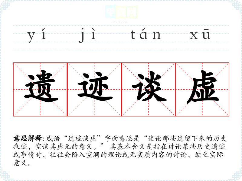 成语“遗迹谈虚”字面意思是“谈论那些遗留下来的历史痕迹,空谈其虚无的意义。” 其基本含义是指在讨论某些历史遗迹或事情时,往往会陷入空洞的理论或无实质内容的讨论,缺乏实际意义。