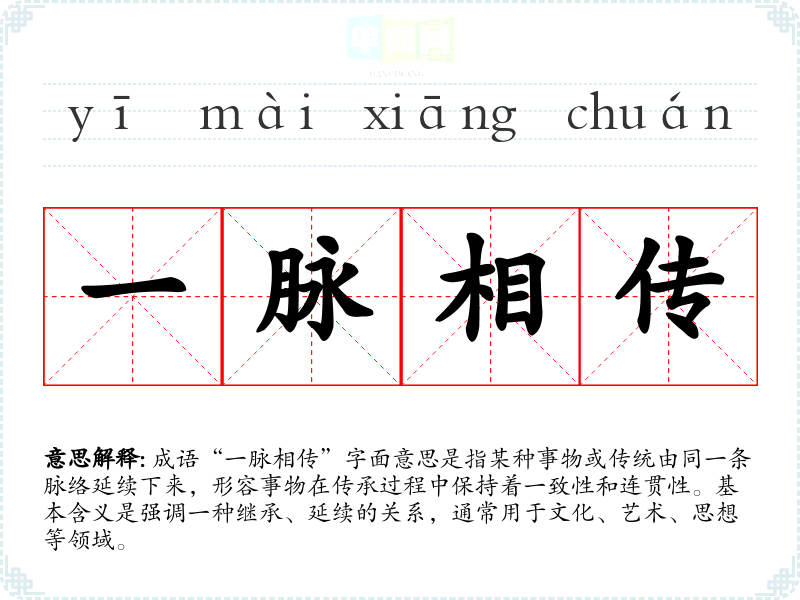 成语“一脉相传”字面意思是指某种事物或传统由同一条脉络延续下来,形容事物在传承过程中保持着一致性和连贯性。基本含义是强调一种继承、延续的关系,通常用于文化、艺术、思想等领域。
