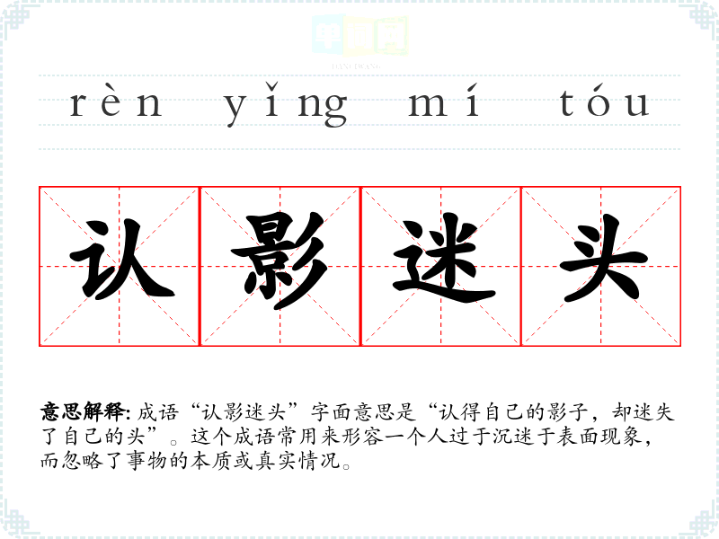 成语“认影迷头”字面意思是“认得自己的影子,却迷失了自己的头”。这个成语常用来形容一个人过于沉迷于表面现象,而忽略了事物的本质或真实情况。