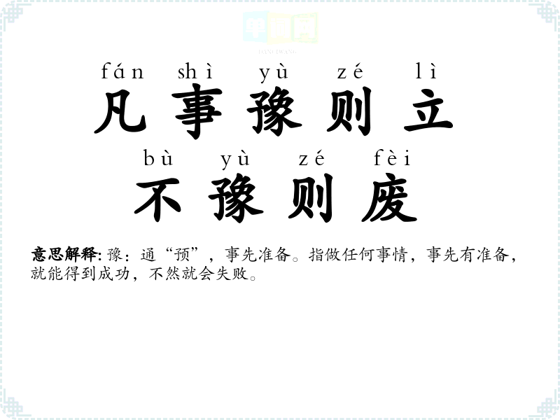 | 凡事预则立,不预则废 | 预:预先,指事先作好计划或准备;立:成就;废:败坏。不论做什么事,事先有准备,就能得到成功,不然就会失败。 |