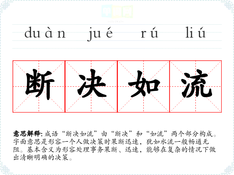 成语“断决如流”由“断决”和“如流”两个部分构成。字面意思是形容一个人做决策时果断迅速,犹如水流一般畅通无阻。基本含义为形容处理事务果断、迅速,能够在复杂的情况下做出清晰明确的决策。