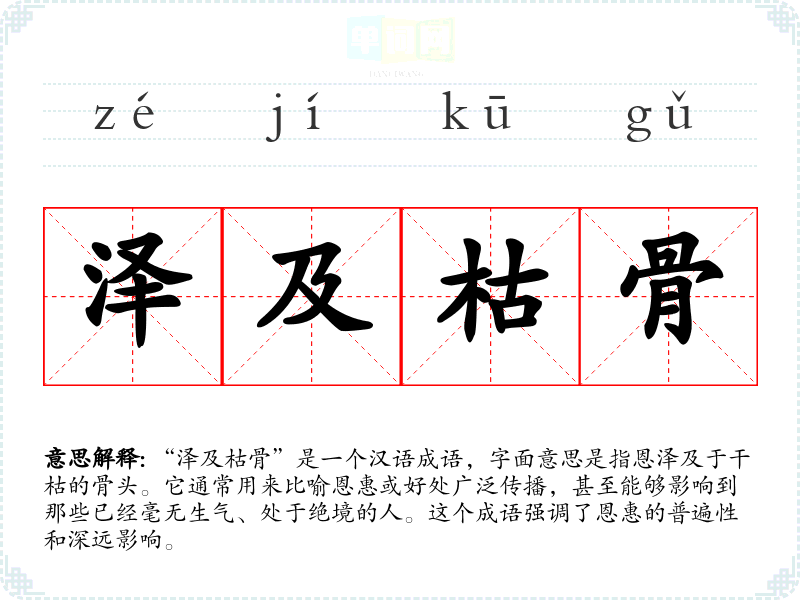 | 泽及枯骨 | 泽:恩泽;枯骨:死去已久的人。恩泽及于死者。形容给人恩惠极大。 |