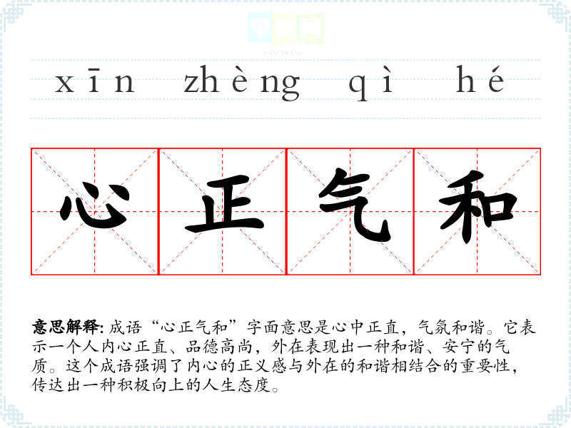 成语“心正气和”字面意思是心中正直,气氛和谐。它表示一个人内心正直、品德高尚,外在表现出一种和谐、安宁的气质。这个成语强调了内心的正义感与外在的和谐相结合的重要性,传达出一种积极向上的人生态度。