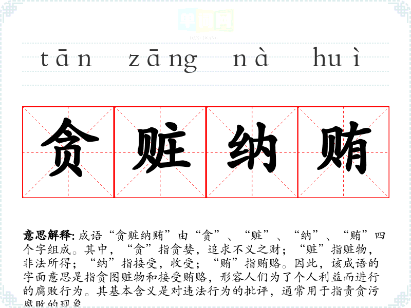 成语“贪赃纳贿”由“贪”、“赃”、“纳”、“贿”四个字组成。其中,“贪”指贪婪,追求不义之财;“赃”指赃物,非法所得;“纳”指接受,收受;“贿”指贿赂。因此,该成语的字面意思是指贪图赃物和接受贿赂,形容人们为了个人利益而进行的腐败行为。其基本含义是对违法行为的批评,通常用于指责贪污腐败的现象。
