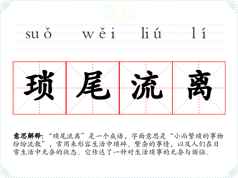 “琐尾流离”是一个成语,字面意思是“小而繁琐的事物纷纷流散”,常用来形容生活中琐碎、繁杂的事情,以及人们在日常生活中无奈的状态。它传达了一种对生活琐事的无奈与烦恼。