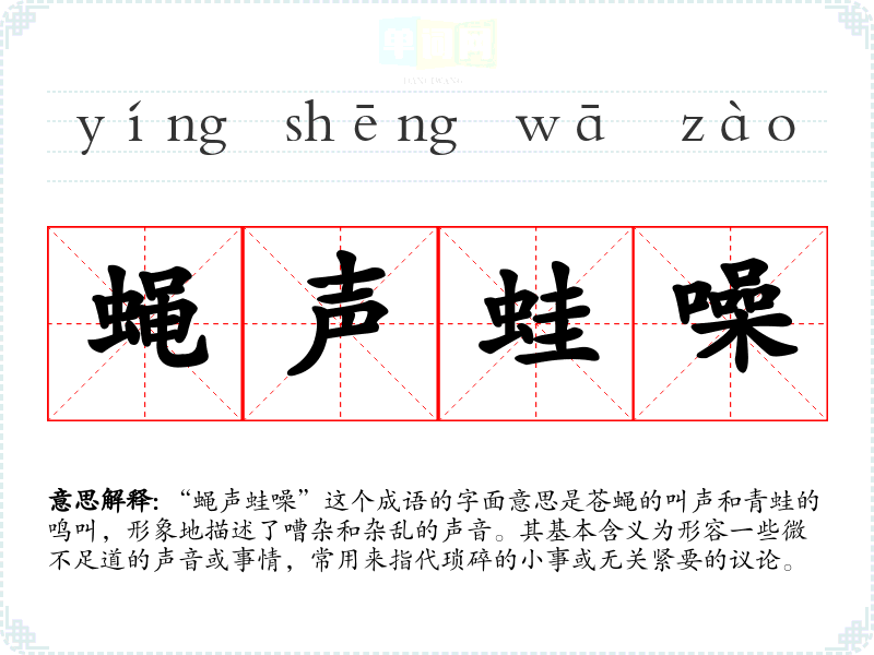 “蝇声蛙噪”这个成语的字面意思是苍蝇的叫声和青蛙的鸣叫,形象地描述了嘈杂和杂乱的声音。其基本含义为形容一些微不足道的声音或事情,常用来指代琐碎的小事或无关紧要的议论。
