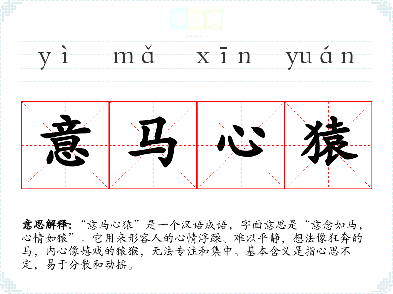 “意马心猿”是一个汉语成语,字面意思是“意念如马,心情如猿”。它用来形容人的心情浮躁、难以平静,想法像狂奔的马,内心像嬉戏的猿猴,无法专注和集中。基本含义是指心思不定,易于分散和动摇。
