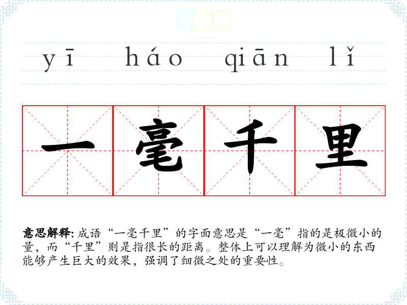 成语“一毫千里”的字面意思是“一毫”指的是极微小的量,而“千里”则是指很长的距离。整体上可以理解为微小的东西能够产生巨大的效果,强调了细微之处的重要性。