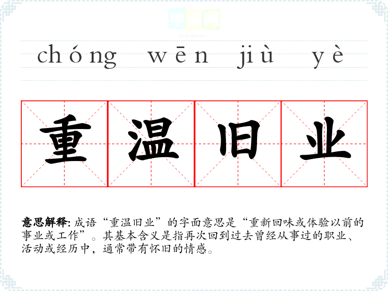 成语“重温旧业”的字面意思是“重新回味或体验以前的事业或工作”。其基本含义是指再次回到过去曾经从事过的职业、活动或经历中,通常带有怀旧的情感。