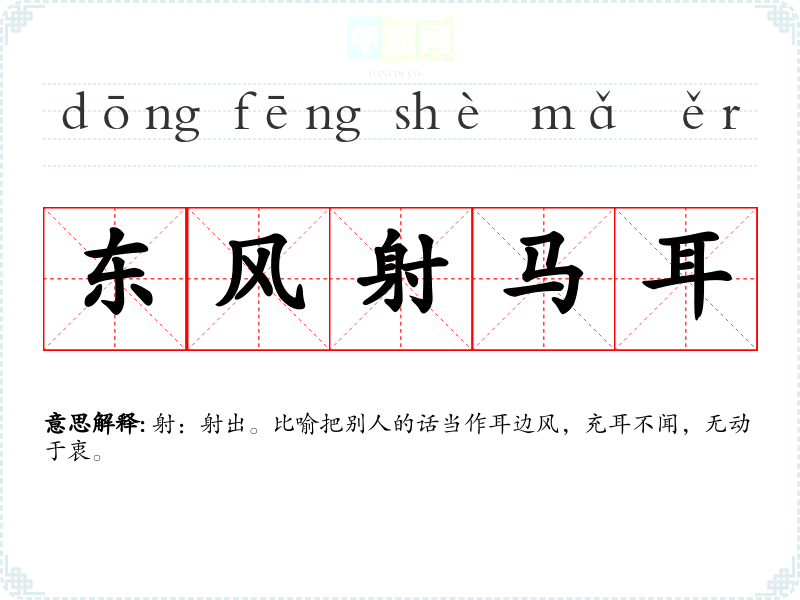 | 东风射马耳 | 射:射出。比喻把别人的话当作耳边风,充耳不闻,无动于衷。 |