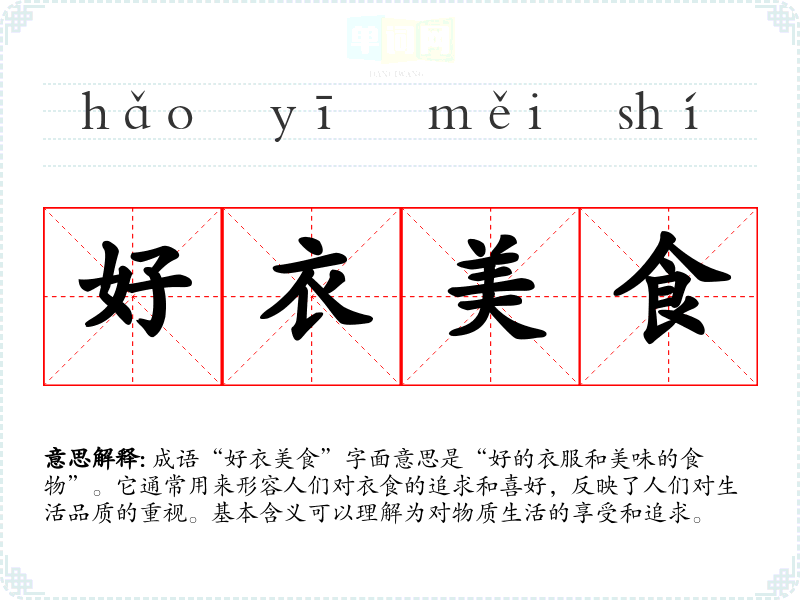 成语“好衣美食”字面意思是“好的衣服和美味的食物”。它通常用来形容人们对衣食的追求和喜好,反映了人们对生活品质的重视。基本含义可以理解为对物质生活的享受和追求。