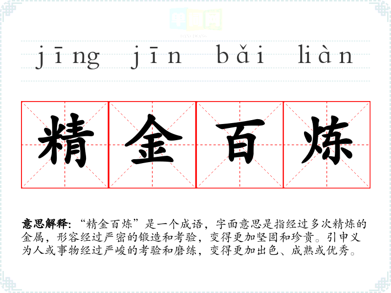 “精金百炼”是一个成语,字面意思是指经过多次精炼的金属,形容经过严密的锻造和考验,变得更加坚固和珍贵。引申义为人或事物经过严峻的考验和磨练,变得更加出色、成熟或优秀。