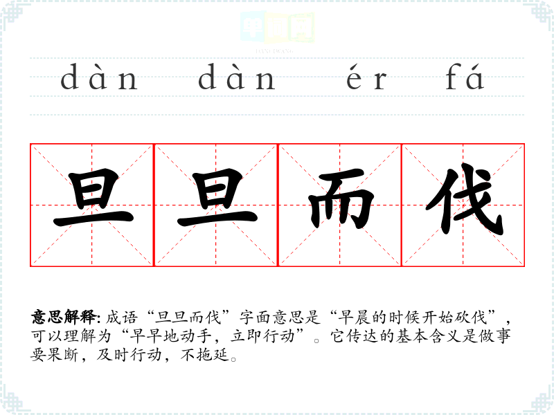 成语“旦旦而伐”字面意思是“早晨的时候开始砍伐”,可以理解为“早早地动手,立即行动”。它传达的基本含义是做事要果断,及时行动,不拖延。