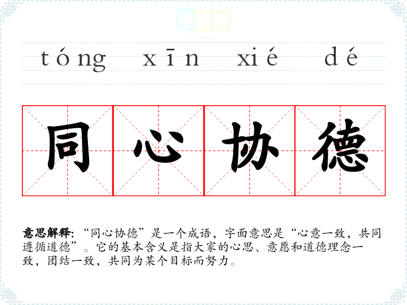 “同心协德”是一个成语,字面意思是“心意一致,共同遵循道德”。它的基本含义是指大家的心思、意愿和道德理念一致,团结一致,共同为某个目标而努力。