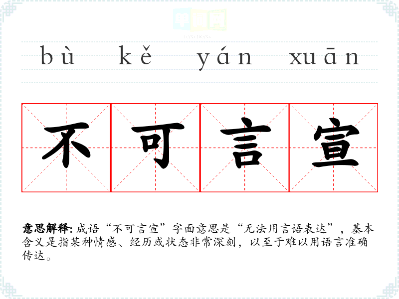 成语“不可言宣”字面意思是“无法用言语表达”,基本含义是指某种情感、经历或状态非常深刻,以至于难以用语言准确传达。