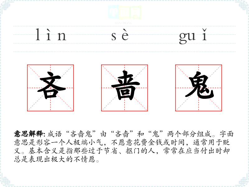 成语“吝啬鬼”由“吝啬”和“鬼”两个部分组成。字面意思是形容一个人极端小气,不愿意花费金钱或时间,通常用于贬义。基本含义是指那些过于节省、抠门的人,常常在应当付出时却总是表现出极大的不情愿。