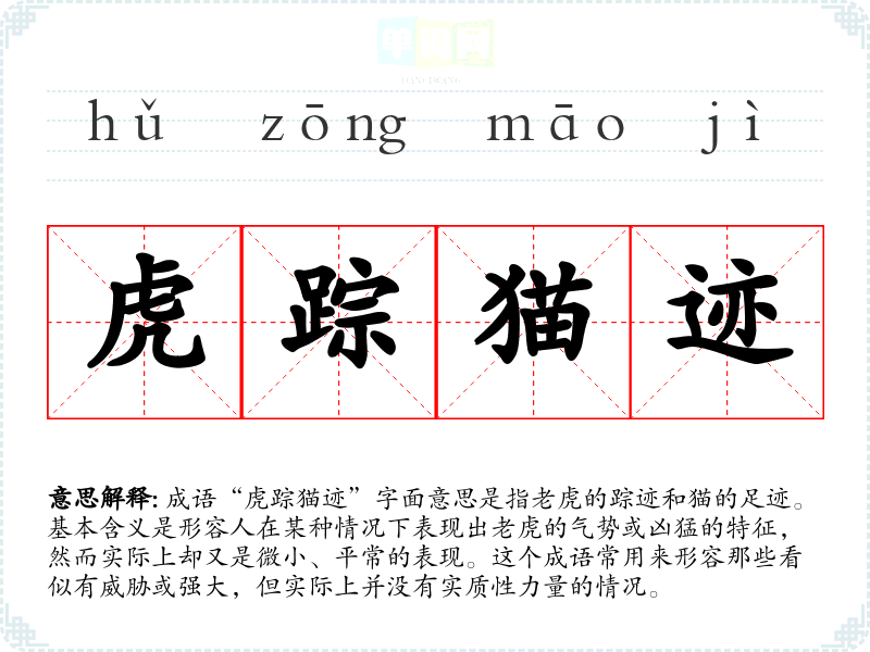 成语“虎踪猫迹”字面意思是指的踪迹和猫的足迹。基本含义是形容人在某种情况下表现出的气势或凶猛的特征,然而实际上却又是微小、平常的表现。这个成语常用来形容那些看似有威胁或强大,但实际上并没有实质性力量的情况。
