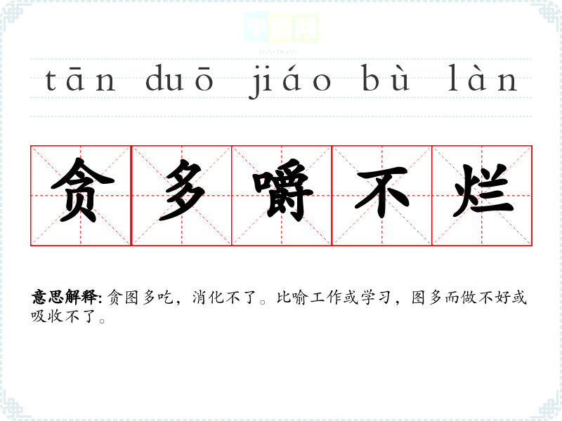 | 贪吃懒做 | 好吃而不肯好好工作。 |