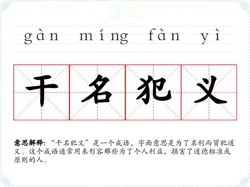 “干名犯义”是一个成语,字面意思是为了名利而冒犯道义。这个成语通常用来形容那些为了个人利益,损害了道德标准或原则的人。
