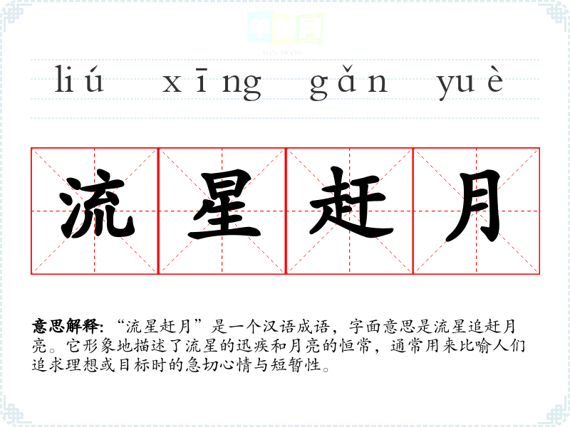 “流星赶月”是一个汉语成语,字面意思是流星追赶月亮。它形象地描述了流星的迅疾和月亮的恒常,通常用来比喻人们追求理想或目标时的急切心情与短暂性。