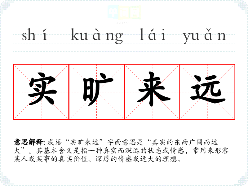 成语“实旷来远”字面意思是“真实的东西广阔而远大”。其基本含义是指一种真实而深远的状态或情感,常用来形容某人或某事的真实价值、深厚的情感或远大的理想。