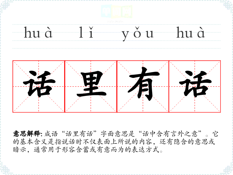 成语“话里有话”字面意思是“话中含有言外之意”。它的基本含义是指说话时不仅表面上所说的内容,还有隐含的意思或暗示,通常用于形容含蓄或有意而为的表达方式。