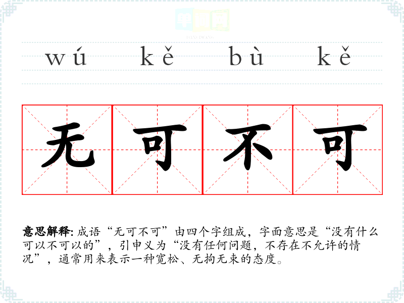 成语“无可不可”由四个字组成,字面意思是“没有什么可以不可以的”,引申义为“没有任何问题,不存在不允许的情况”,通常用来表示一种宽松、无拘无束的态度。